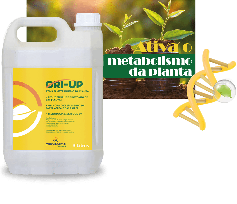Ori-Up é um fertilizante foliar desenvolvido com a tecnologia Metabolic DX que atua no metabolismo das plantas, mitigando a toxidade causada pela aplicação de herbicidas pós-emergentes, desta forma, sua fórmula exclusiva, também promove a saúde vegetal e aumenta a imunidade das plantas à estresses bióticos e abióticos, além de atuar na nutrição. Ori-Up é um produto de fácil aplicação e rápida absorção.